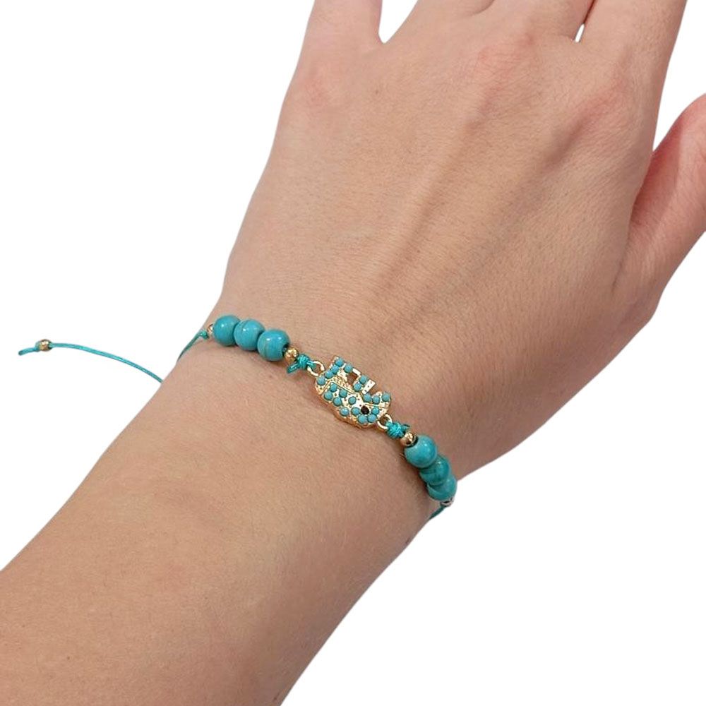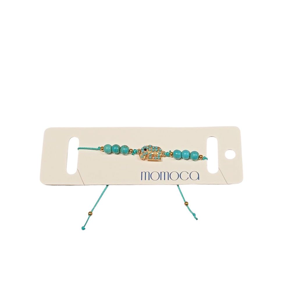 Κομψό βραχιόλι με τιρκουάζ χάντρες και διακοσμητικό στοιχείο σε σχήμα ελέφαντα με στρας. Διαθέτει αυξομειούμενο κορδόνι για ιδανική εφαρμογή σε κάθε καρπό. Φοριέται εύκολα μόνο του ή σε συνδυασμό με άλλα βραχιόλια. Κατάλληλο για καθημερινή χρήση ή ως boho δώρο. Πωλείται σε σετ των 12 τεμαχίων.