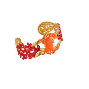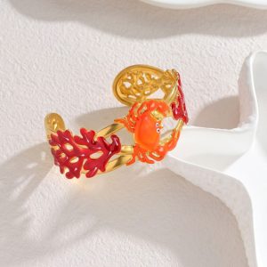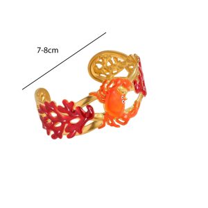 Εντυπωσιακό χειροπέδα βραχιόλι από ανοξείδωτο ατσάλι με μοναδικό θαλάσσιο σχεδιασμό. Διακοσμείται με καβούρι στο κέντρο και ανάγλυφα φύλλα σε πράσινες αποχρώσεις, δημιουργώντας ένα ιδιαίτερο και καλλιτεχνικό αποτέλεσμα εμπνευσμένο από τη φύση και τη θάλασσα.