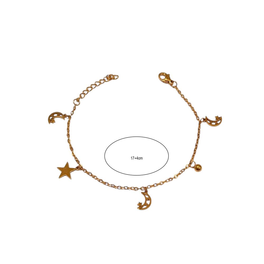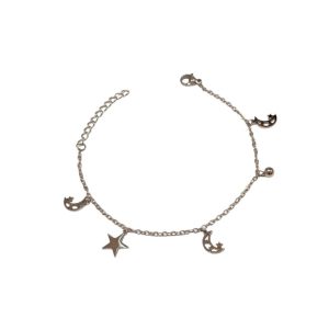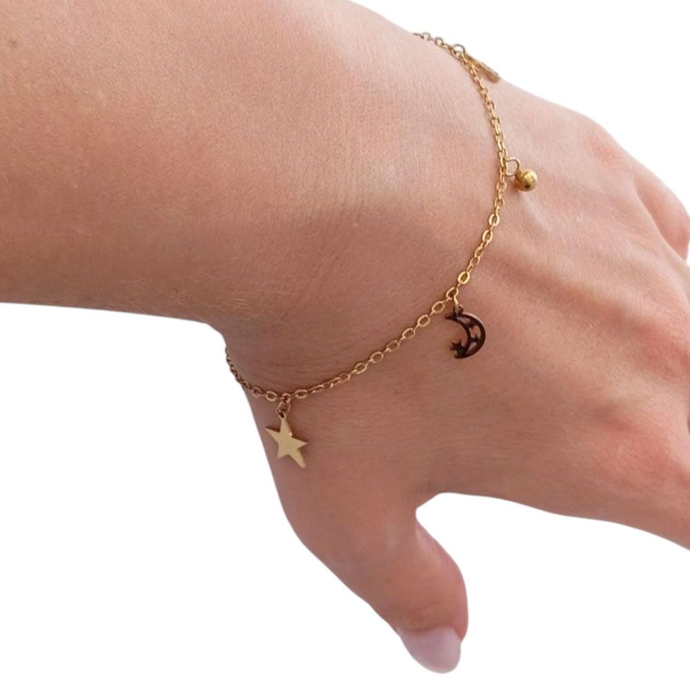 Εντυπωσιακό βραχιόλι με κρεμαστά μοτίφ φεγγάρια, αστέρι και μπίλιες, ιδανικό για να δώσει μια παιχνιδιάρικη και ρομαντική πινελιά στο στυλ σας. Φοριέται άνετα μόνο του ή σε layering με άλλα κοσμήματα. Διατίθεται σε δύο χρώματα: ασημί και χρυσό.