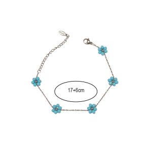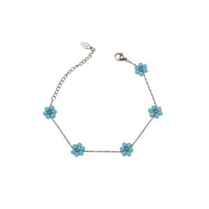 Ρομαντικό βραχιόλι από ανοξείδωτο ατσάλι, διακοσμημένο με μπλε λουλούδια που χαρίζουν φρεσκάδα και καλοκαιρινή διάθεση. Διαθέτει αλυσίδα προέκτασης για ρύθμιση μεγέθους και κούμπωμα ασφαλείας. Ένα χαριτωμένο και κομψό κόσμημα που δίνει χρώμα και στυλ σε κάθε εμφάνιση, ιδανικό για καθημερινή χρήση αλλά και για δώρο.