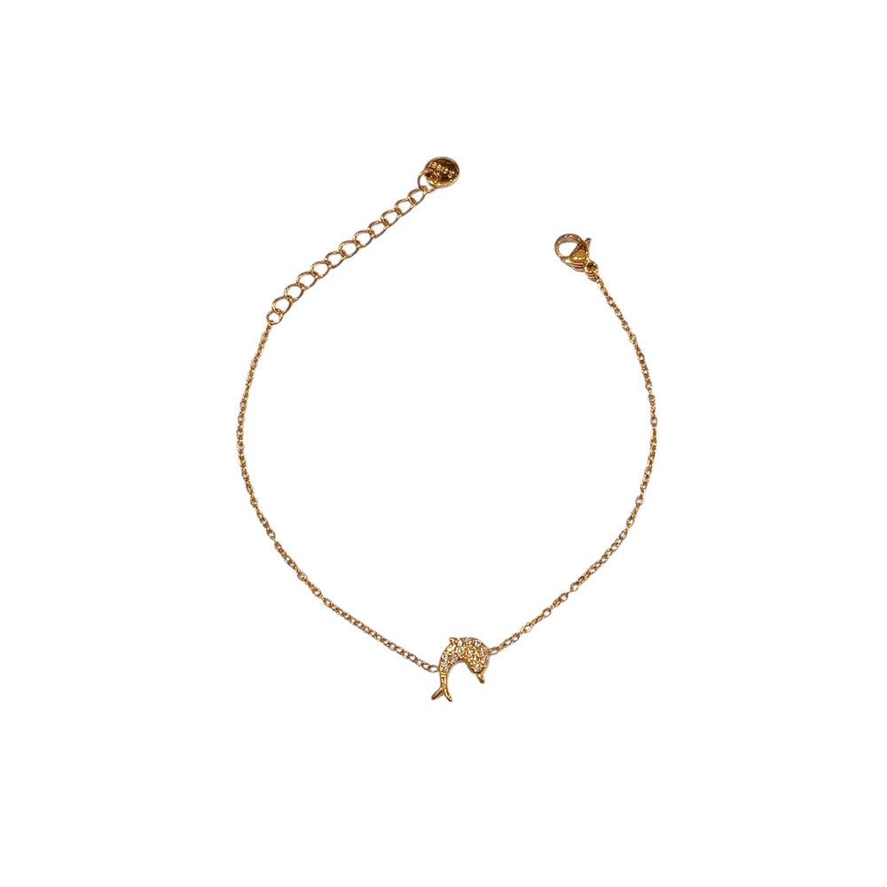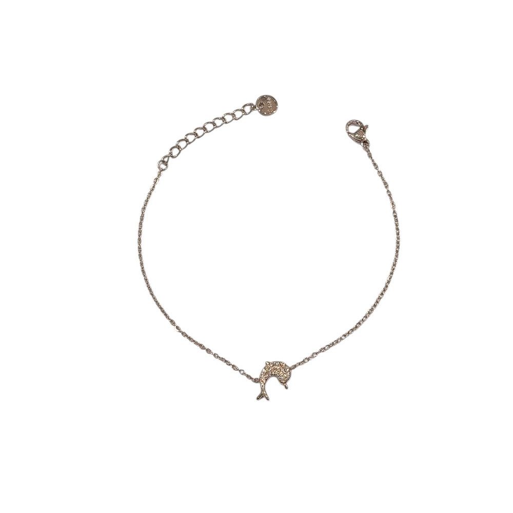 Κομψό βραχιόλι από ανοξείδωτο ατσάλι με λεπτή αλυσίδα και κεντρικό μοτίφ δελφίνι διακοσμημένο με λαμπερά ζιρκόν. Διαθέτει αλυσίδα προέκτασης για εύκολη ρύθμιση στο μήκος που επιθυμείτε και ασφαλές κούμπωμα. Ένα διακριτικό αλλά εντυπωσιακό κόσμημα που αποπνέει κομψότητα και καλοκαιρινή διάθεση.