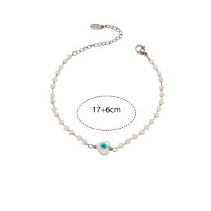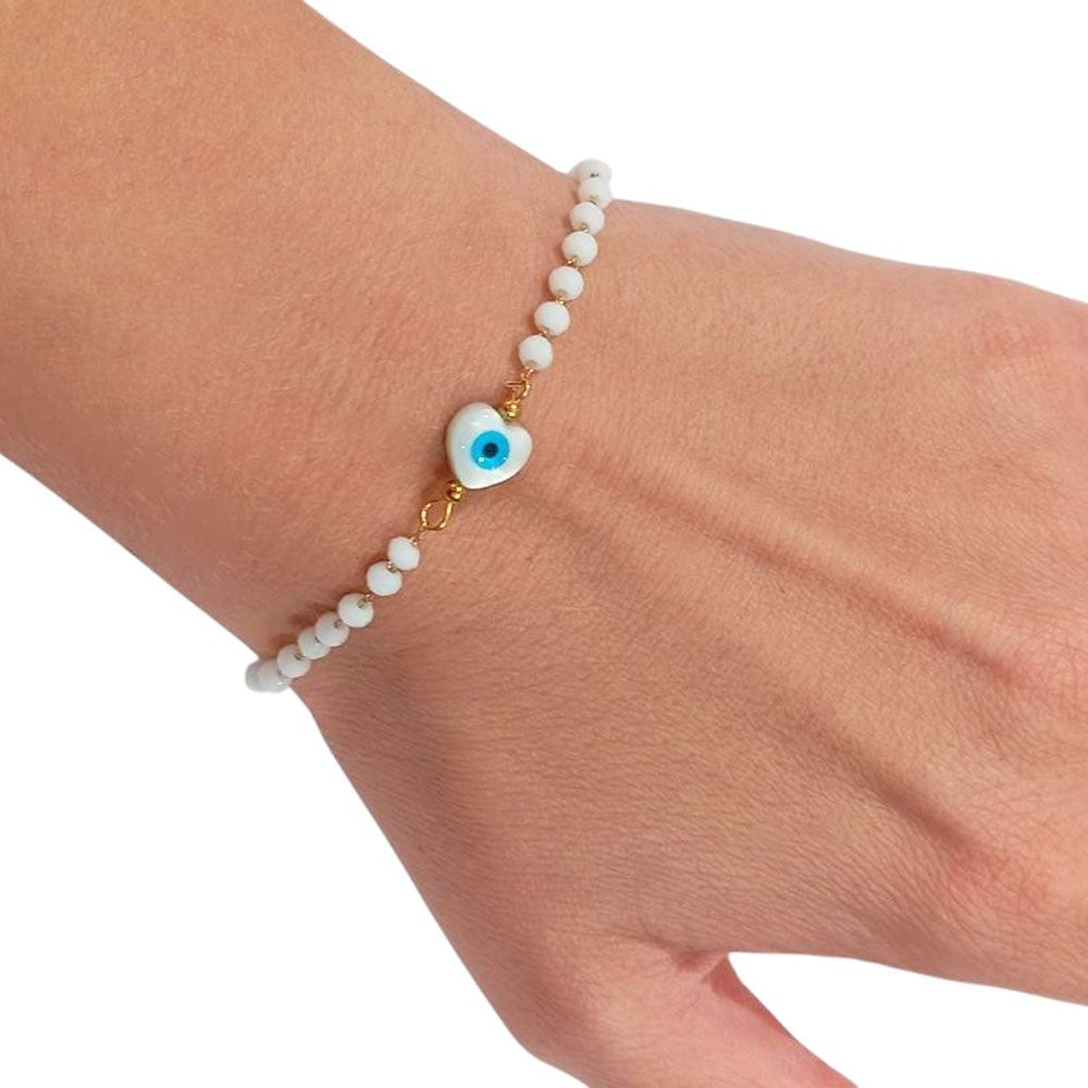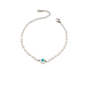 Ένα κομψό βραχιόλι από ανοξείδωτο ατσάλι, διακοσμημένο με λευκές χάντρες και κεντρικό ματάκι σε φυσικό σχήμα που προσφέρει προστασία και στυλ. Ο διαχρονικός συνδυασμός του λευκού με το γαλάζιο δημιουργεί μια φρέσκια και καλοκαιρινή αισθητική, ιδανική για καθημερινή χρήση αλλά και για ιδιαίτερες περιστάσεις. Διατίθεται σε χρυσό και ασημί χρώμα.
