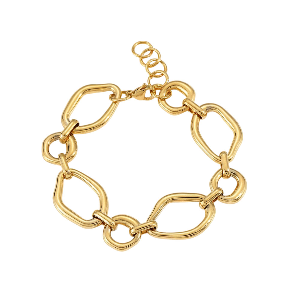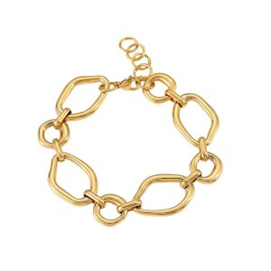 Μοντέρνο και κομψό, αυτό το βραχιόλι από ανοξείδωτο ατσάλι ξεχωρίζει χάρη στους μεγάλους ασύμμετρους οβάλ κρίκους του, που δημιουργούν μια elegant αλλά ταυτόχρονα minimal αισθητική. Η λαμπερή χρυσή επιμετάλλωση παραμένει αναλλοίωτη, αφού το ανοξείδωτο ατσάλι δεν μαυρίζει και δεν αλλοιώνεται με τον χρόνο.