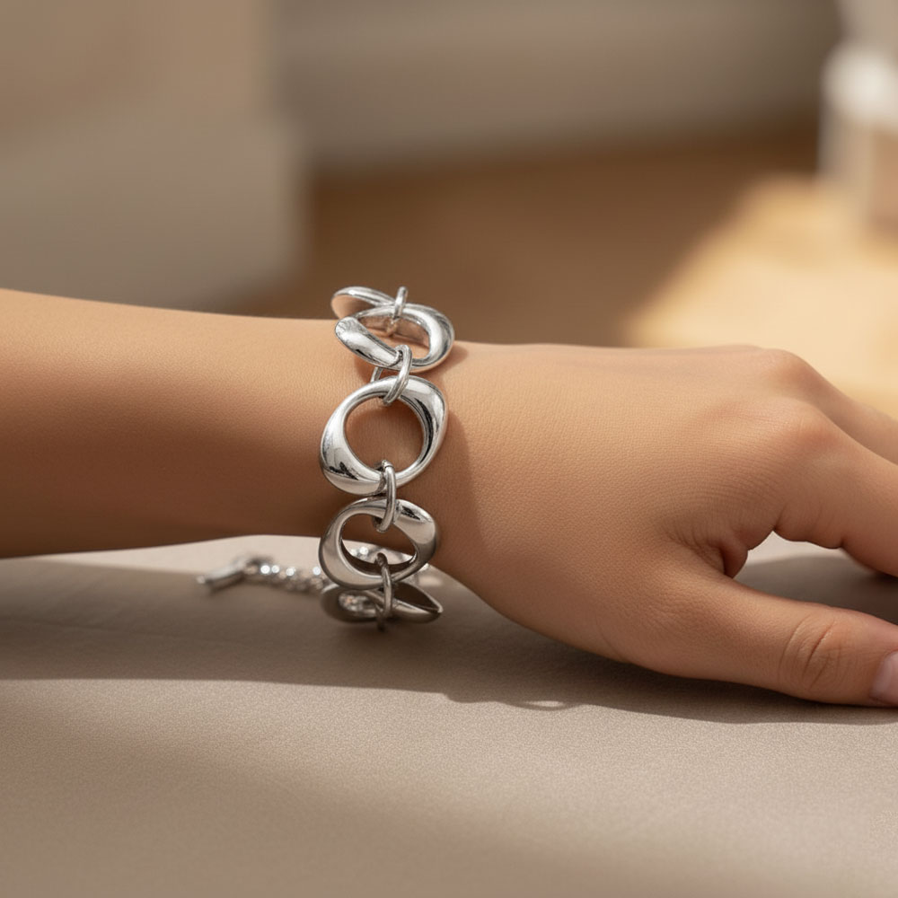 Εντυπωσιακό ασημί βραχιόλι με μεγάλους καμπυλωτούς κρίκους, που δημιουργούν ένα κομψό και μοντέρνο αποτέλεσμα. Ο bold σχεδιασμός του το κάνει ιδανικό τόσο για την καθημερινότητα όσο και για πιο βραδινές εμφανίσεις. Ελαφρύ, άνετο και ανθεκτικό, προσθέτει μια elegant πινελιά σε κάθε look. Διαθέτει ρυθμιζόμενο μήκος 15+5cm για τέλεια εφαρμογή.