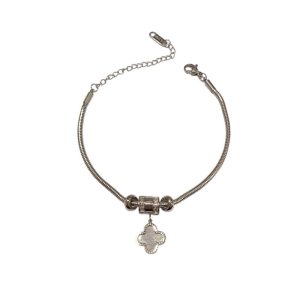 Κομψό βραχιόλι από ανοξείδωτο ατσάλι με snake chain αλυσίδα, διακοσμημένο με κεντρική μπίλια και εντυπωσιακό κρεμαστό τετράφυλλο στοιχείο σε μαύρο ή λευκό φινίρισμα. Διαθέσιμο σε χρυσό και ασημί χρώμα. Ιδανικό για να προσθέσει μία εκλεπτυσμένη πινελιά σε κάθε σας εμφάνιση.