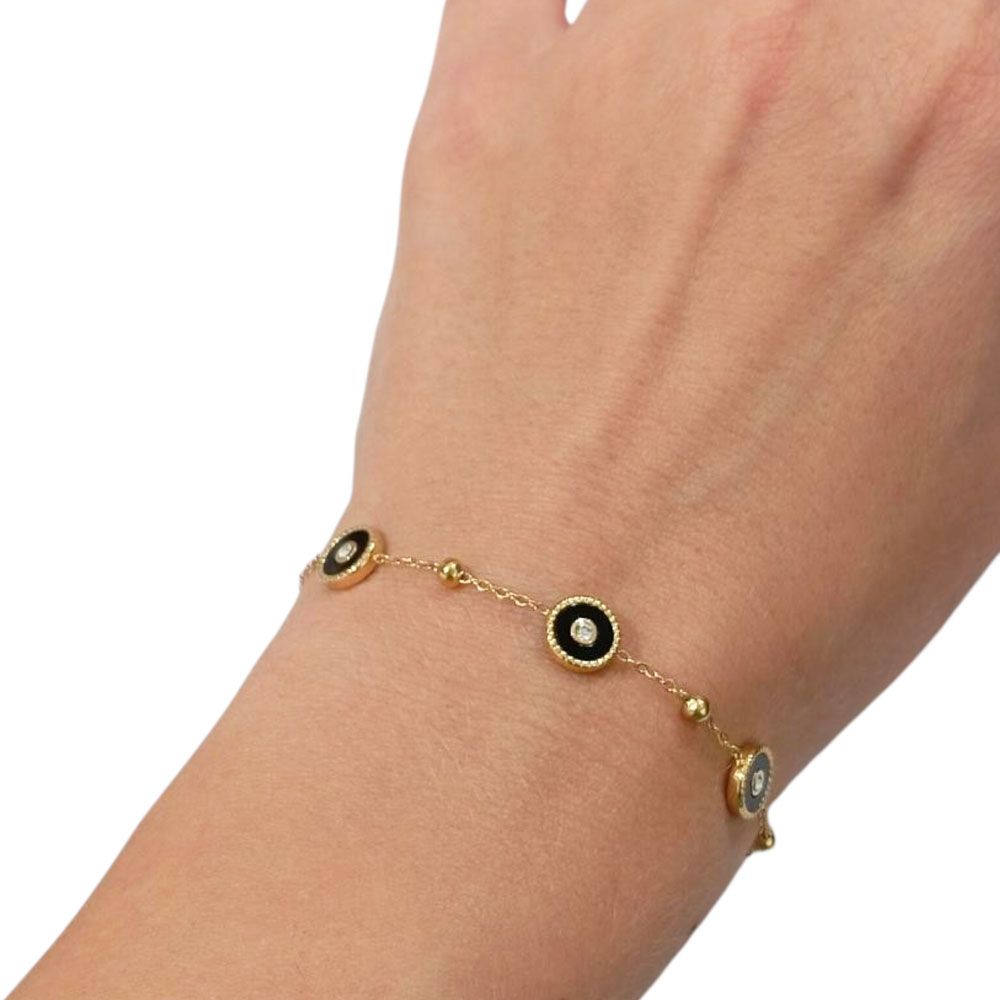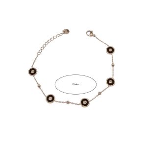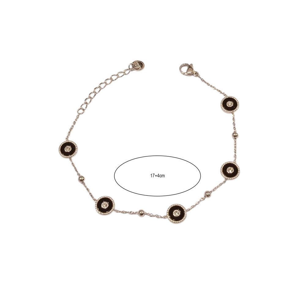 Κομψό βραχιόλι με πέντε στρογγυλά μαύρα στοιχεία, διακοσμημένα με λαμπερά ζιργκόν στο κέντρο. Διαθέσιμο σε δύο εκδοχές: χρυσό και ασημί, ιδανικό για καθημερινή χρήση ή βραδινές εμφανίσεις. Προσαρμόσιμο μήκος για άνετη εφαρμογή.