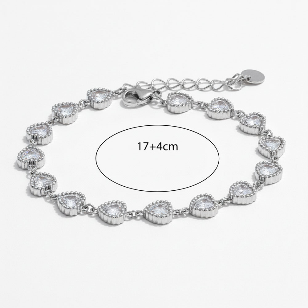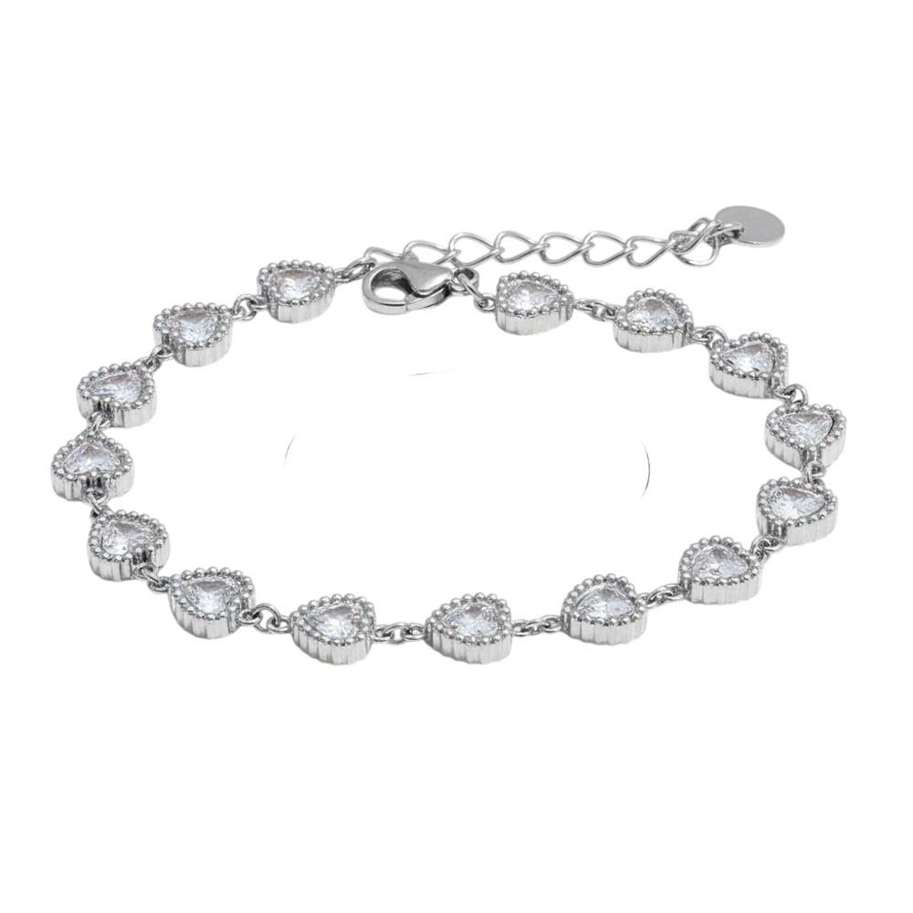 Κομψό βραχιόλι τύπου riviera από ανοξείδωτο ατσάλι σε ασημί απόχρωση, διακοσμημένο με λαμπερές λευκές πέτρες σε σχήμα καρδιάς που σχηματίζουν μια συνεχόμενη γραμμή λάμψης γύρω από τον καρπό. Ο ρομαντικός σχεδιασμός των καρδιών σε συνδυασμό με το διαχρονικό riviera ύφος προσφέρει κομψότητα και ιδιαίτερη θηλυκότητα.Με μήκος 17+4 cm, εφαρμόζει άνετα και ρυθμίζεται εύκολα. Ανθεκτικό, υποαλλεργικό και ιδανικό για καθημερινή χρήση αλλά και πιο elegant περιστάσεις, αποτελεί ένα λαμπερό κόσμημα που αναδεικνύει κάθε εμφάνιση.