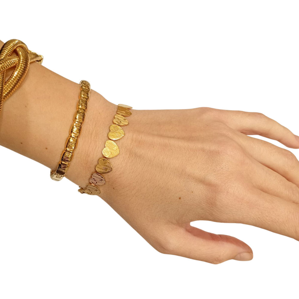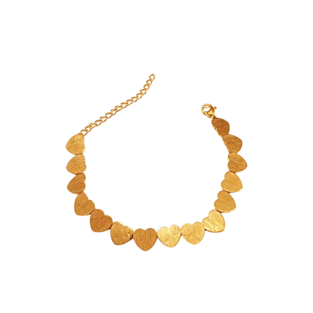 Κομψό βραχιόλι από ανοξείδωτο ατσάλι σε χρυσή απόχρωση, διακοσμημένο με σειρά από μικρές καρδιές με ματ, ανάγλυφη υφή. Ελαφρύ και άνετο στον καρπό, προσθέτει μια ρομαντική αλλά ταυτόχρονα μοντέρνα πινελιά σε κάθε εμφάνιση. Ανθεκτικό, υποαλλεργικό και ιδανικό για καθημερινό στυλ ή για layering με άλλα βραχιόλια.