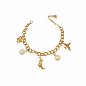 Κομψό και παιχνιδιάρικο βραχιόλι από ανοξείδωτο ατσάλι με αλυσίδα, διακοσμημένο με πέρλες και κρεμαστά στοιχεία που προσθέτουν μοναδικό χαρακτήρα και κίνηση στον καρπό. Ο συνδυασμός των διακοσμητικών λεπτομερειών δημιουργεί ένα ιδιαίτερο αποτέλεσμα που ταιριάζει τόσο σε καθημερινές όσο και σε πιο stylish εμφανίσεις. Με μήκος 16+5 cm εφαρμόζει άνετα και ρυθμίζεται εύκολα, ενώ η ανθεκτική και υποαλλεργική κατασκευή του το καθιστά μια ξεχωριστή επιλογή για κάθε συλλογή κοσμημάτων.