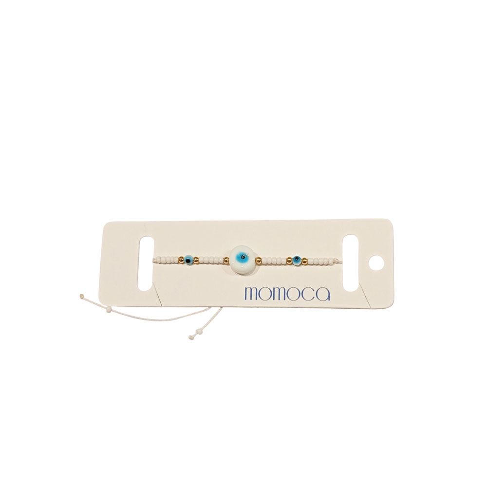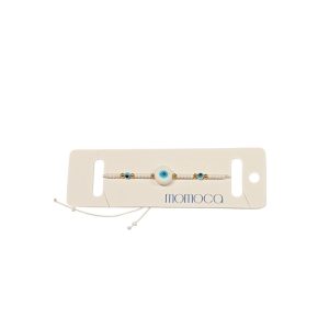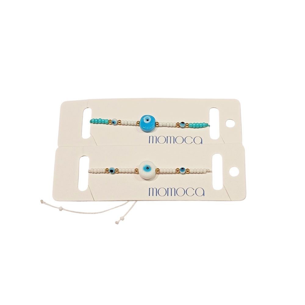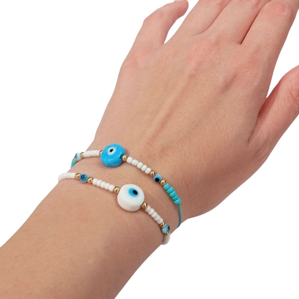 Χειροποίητα βραχιόλια με λεπτές λευκές και γαλάζιες χάντρες και εντυπωσιακό κεντρικό ματάκι σε στρογγυλή μορφή. Το κορδόνι αυξομειώνεται για άνετη εφαρμογή σε όλους τους καρπούς. Ιδανικά για καλοκαιρινά δώρα, τουριστικά καταστήματα και καθημερινή προστασία με στυλ. Σετ 12 τεμαχίων με καρτελάκι.