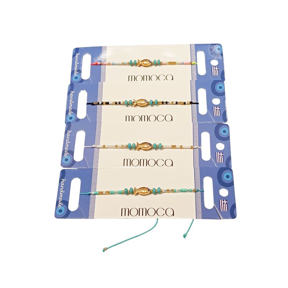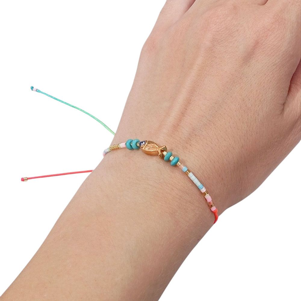 Χειροποίητα βραχιόλια με πολύχρωμες γυάλινες χάντρες και μεταλλικό χρυσό ψαράκι στο κέντρο με διακριτικό ματάκι. Το αυξομειούμενο κορδόνι προσφέρει άνετη εφαρμογή για κάθε καρπό. Ιδανικά για τουριστικά καταστήματα, καλοκαιρινά outfit και δώρα. Πωλούνται σε σετ 12 τεμαχίων με καρτελάκι παρουσίασης.