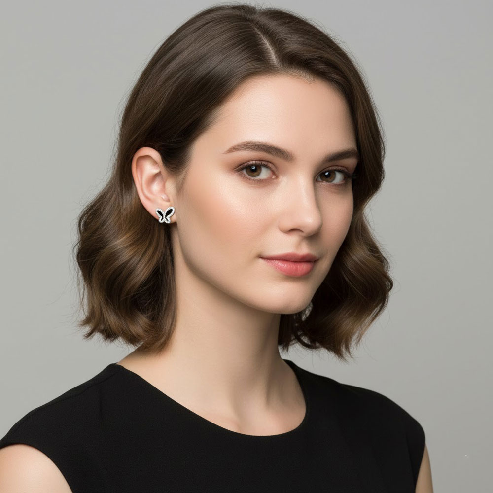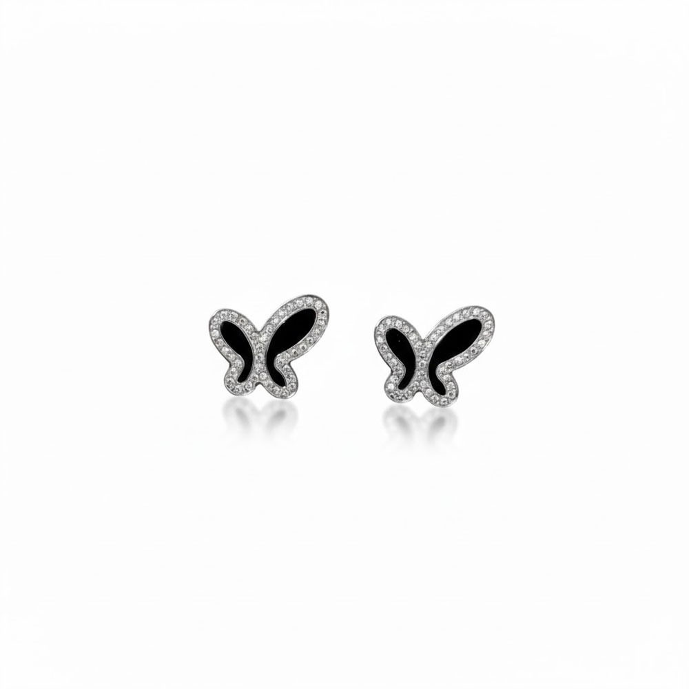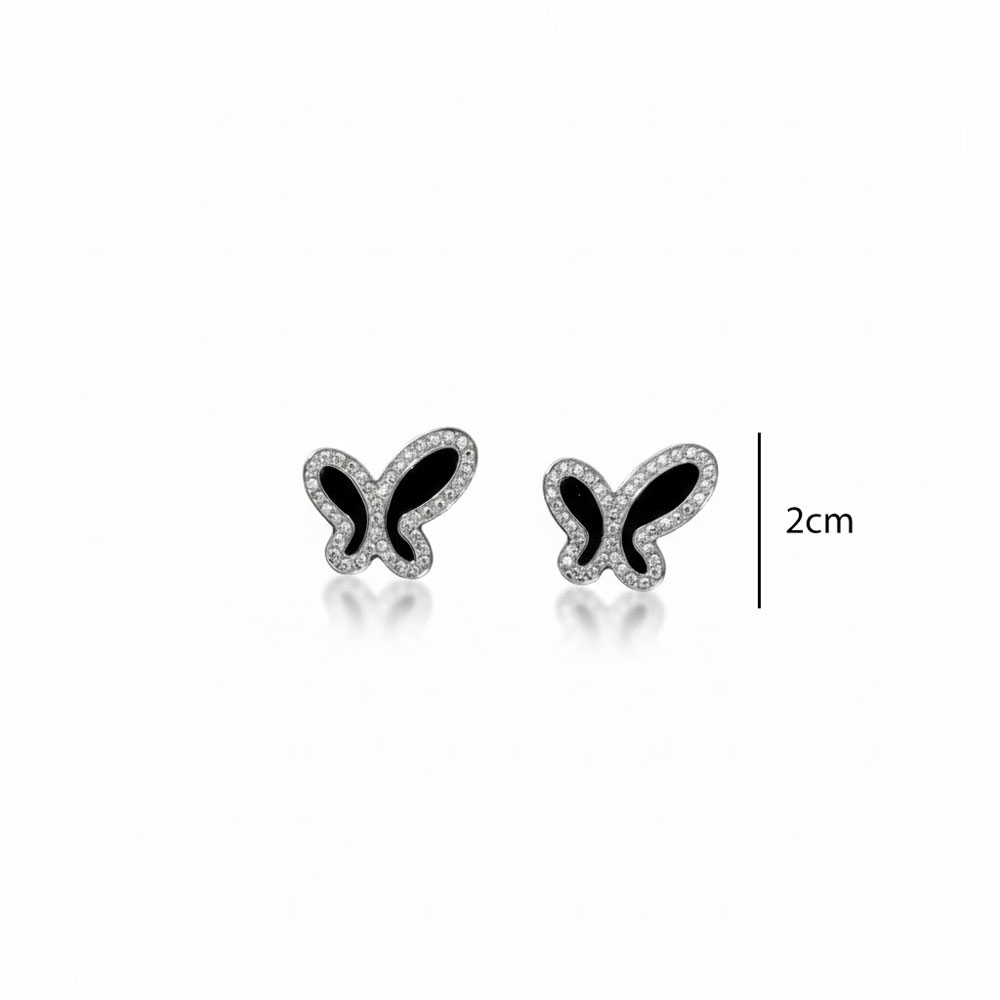 Κομψά σκουλαρίκια από ανοξείδωτο ατσάλι σε σχήμα πεταλούδας, διακοσμημένα με μαύρο σμάλτο και λαμπερά στρας περιμετρικά που προσθέτουν ιδιαίτερη λάμψη και θηλυκότητα ιδανικά για καθημερινό και βραδινό στιλ