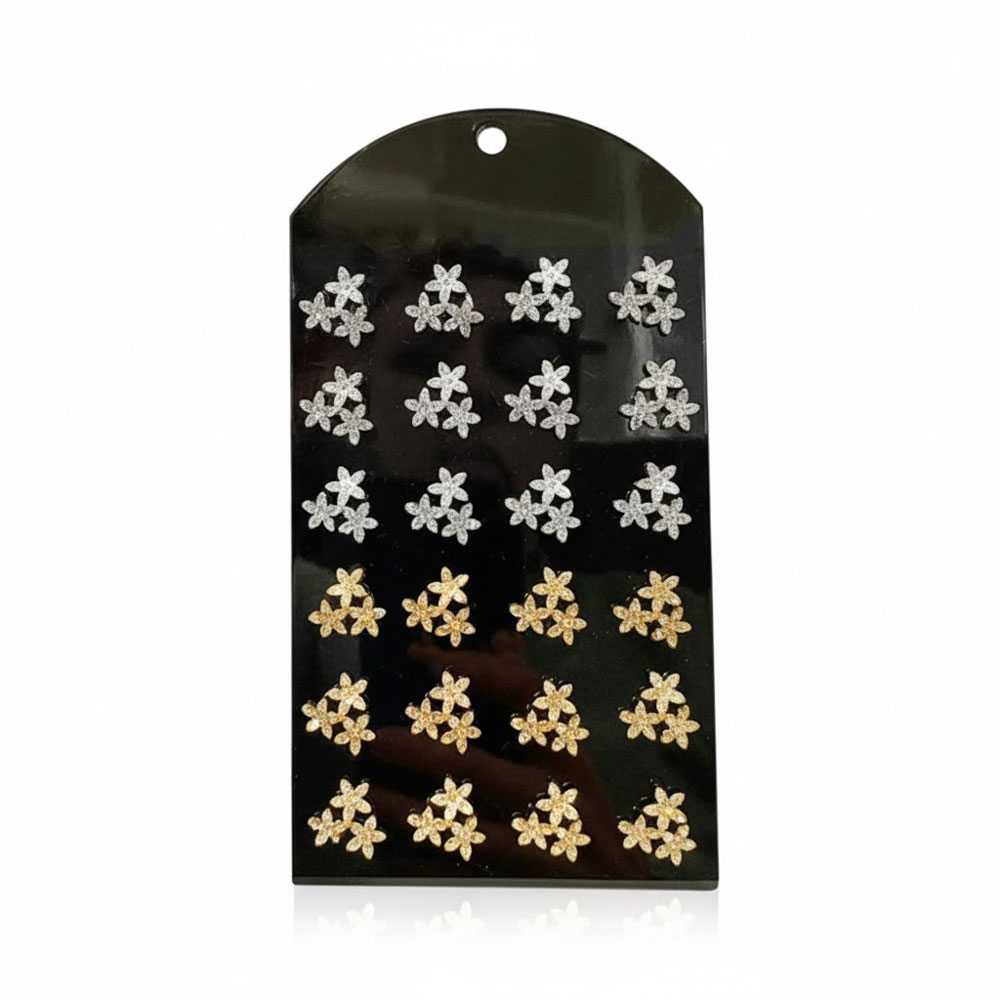 Λαμπερά σκουλαρίκια σε σχέδιο μικρών λουλουδιών, διακοσμημένα με στρας που χαρίζουν κομψότητα και διαχρονική θηλυκότητα. Ελαφριά και εντυπωσιακά, ιδανικά για καθημερινή χρήση αλλά και για πιο ιδιαίτερες εμφανίσεις. Το σετ περιλαμβάνει 12 ζευγάρια σε όμορφους χρωματικούς συνδυασμούς. Δεν είναι από ατσάλι.